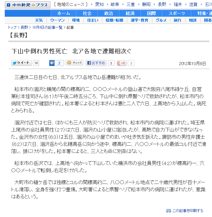 そういえばテン場へ戻った時に、長野県警の方が事故現場で60代の女性の心臓マッサージをして頂いた方を拡声器で探していた。ヘリコプターで救助するまで看病してくれた人がいたらしい。その後の生死は山岳救助隊から病院の方へバトンタッチしたので分からないようだった。