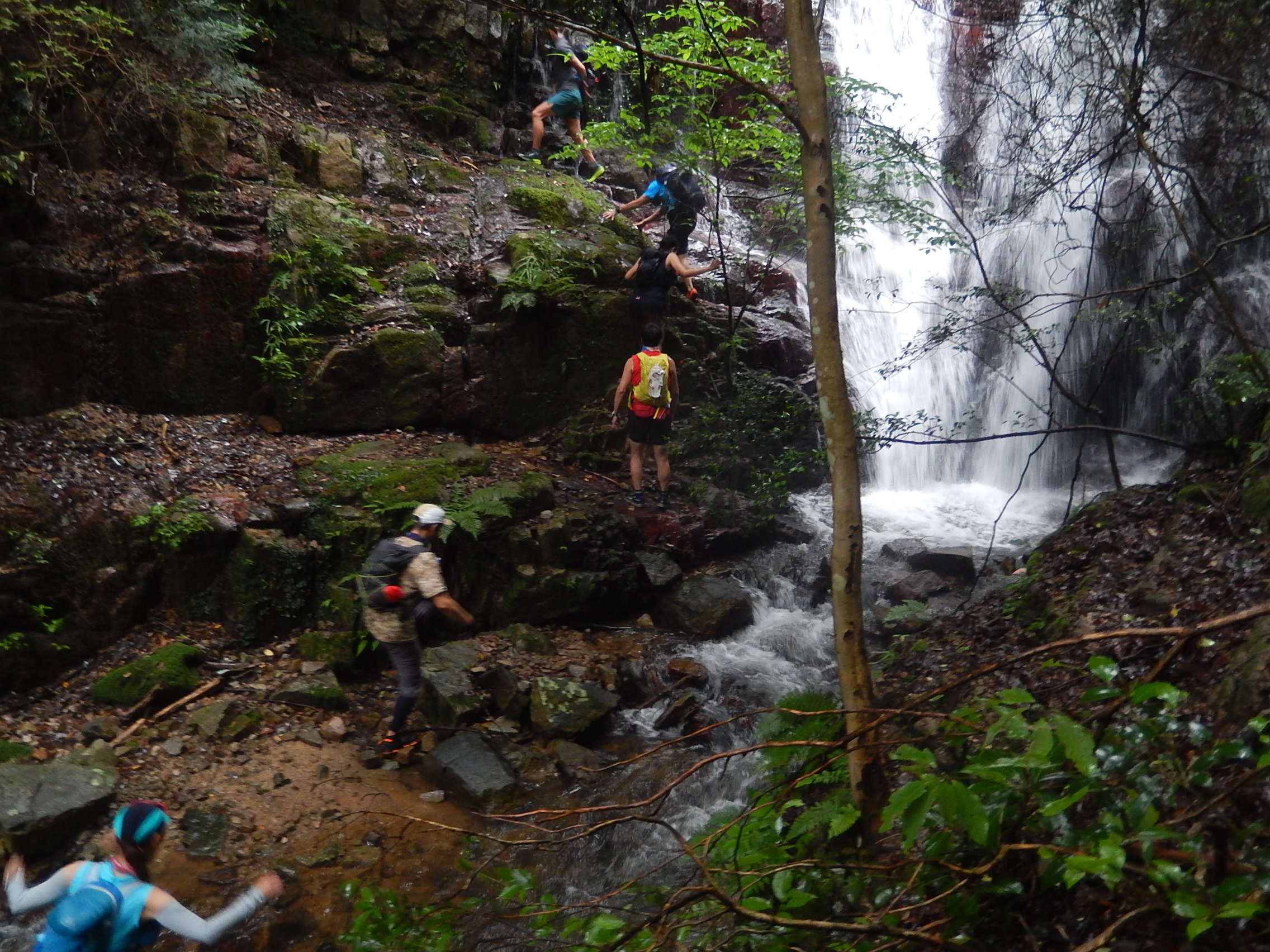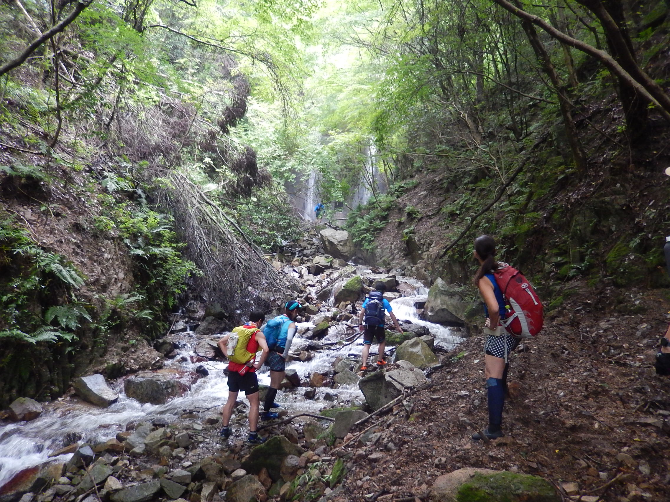 前日雨が降ったので水量がかなり増えていた 一人だけ渓流シューズで他はトレランシューズ 水量が多かったが、道がわかりにくいとか、滑りやすいということはなかった |