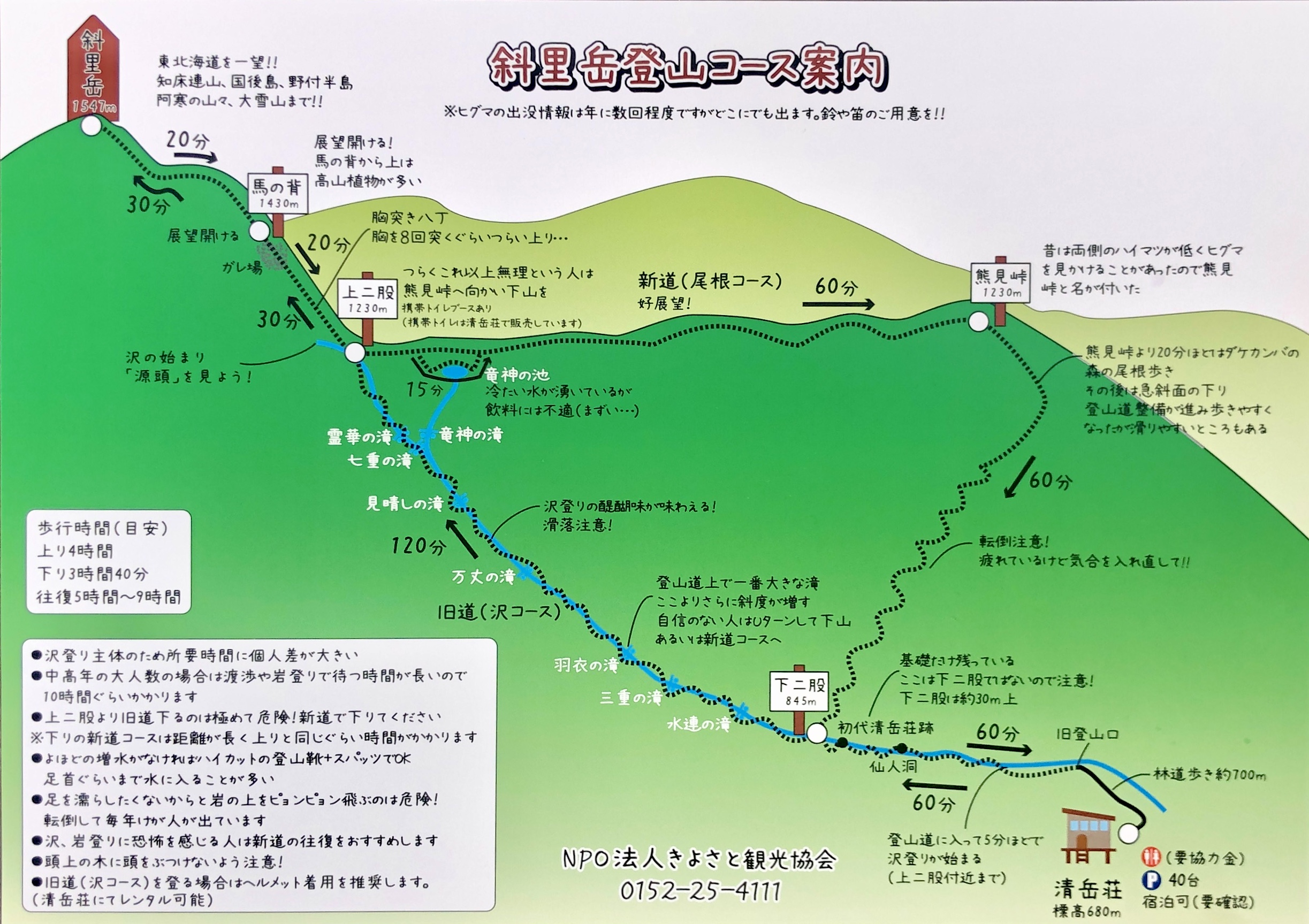 | その他周辺情報 | ◆清岳荘 https://topics.kiyosatokankou.com/2022/03/blog-post_25.html ・登山口にある宿。鉄筋コンクリの立派な建物 ・2120円/泊。素泊のみ。コロナ対応で今は寝具の提供も無い。寝袋持参要 ・電子レンジ、電子ポットあり。お湯もらえる。コンセントあり。 ※ 施設内の水は飲めないので持参要とされているが、煮沸するならOKらしい。 (水道水を下から運んできてタンクに貯めた水とのこと) ・水洗トイレ。 ・21時消灯だが、WC等は照明ついてるのでヘッドランプは無くてもOK。 ・2Fのバルコニーは眺めよく、斜里市街や海岸を見下ろせる。携帯電波もよく入る。 |