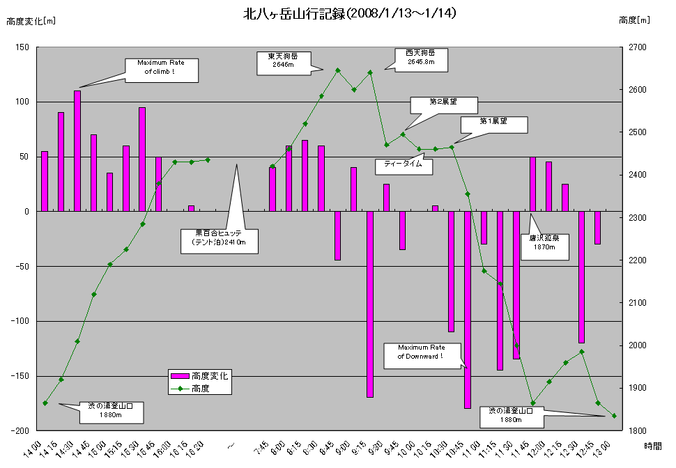 2年ぶりの冬山として、3年前に散々な目にあった天狗岳〜唐沢鉱泉コースを辿る事にした。ルートとしては同じだが、前回は渋御殿湯に泊まったのに対し今回は黒百合ヒュッテ前にテント泊する事に。マイナス20℃までは耐えられるシュラフを買って初の山行だ。中央道諏訪南I.C.で降りて、一般道で渋御殿湯に向かう。3年前よりは雪が若干少ない感じで、前回チェーンをつけた場所よりやや登ったところで装着。そこから急登が始まり13:30頃には渋御殿湯に到着した。駐車券をもらいすぐ登山準備にかかる。最初はアイゼン不要かな、と考え14:00に登りはじめた。ところが、沢をわたった最初の登りでいきなり滑るような斜面だ。ずるずるするので早速アイゼン装着。10本爪はaiaimanに貸したので今回は6本の軽アイゼンだ。aiaimanは今回が本格冬山初挑戦だ。寒さはあまり感じず黙々と進んでいった。天気がよく登りが急になると汗ばんで来るくらいだ。ここで服の調節をしなかった事が後で良くない事につながる。2時間ほどで黒百合平に到着し早速テント設営の準備を始めた。自分のほうは逆にテント泊は初めて。