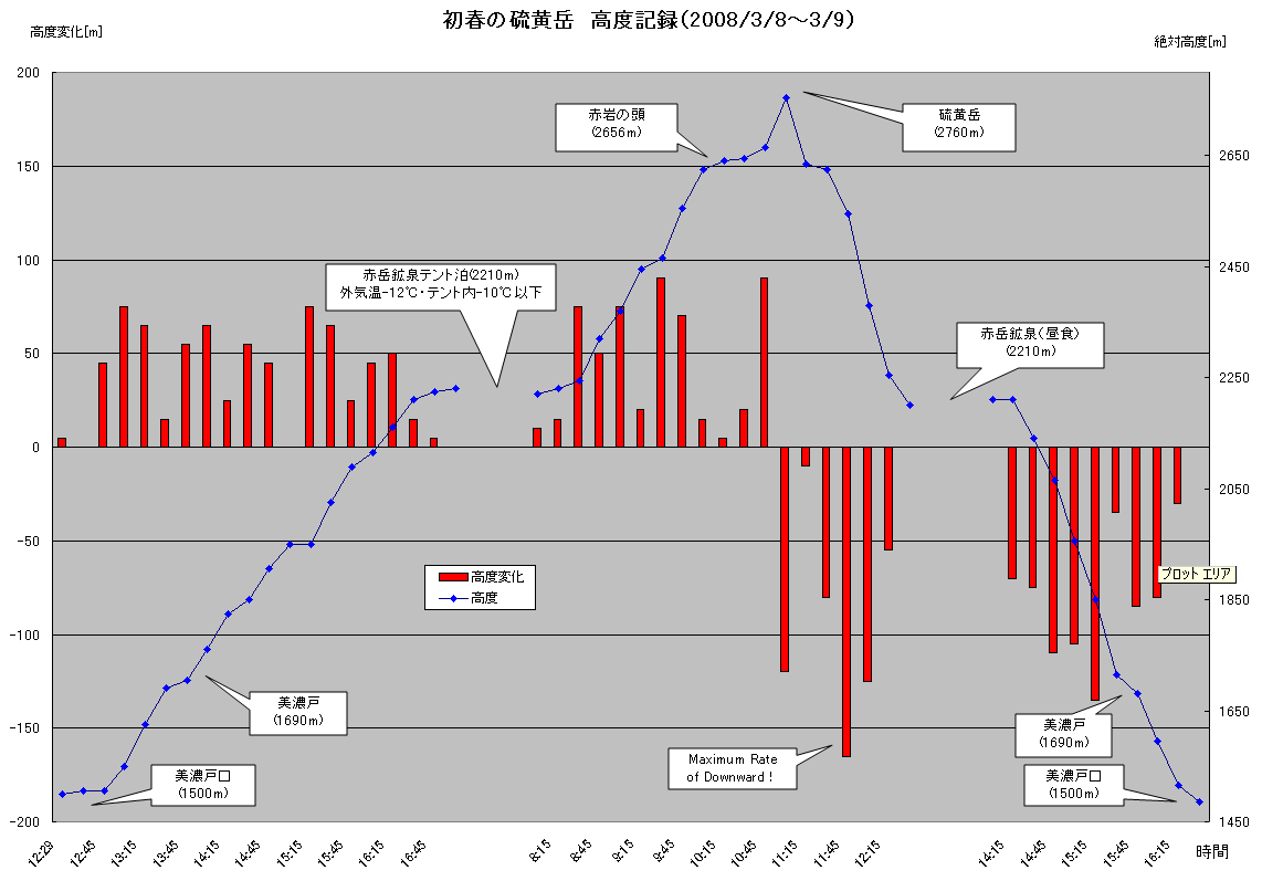 赤岳鉱泉までは、トレースがしっかりついていて冬靴でOKです。 赤岳鉱泉は、テン泊者には冬期でも水を提供してくれます(鉱泉の味がしますが)。 http://www.alles.or.jp/~akadake/index.html ※GPSのトレースは硫黄岳山頂の50m直前で止まっています。 また、GPSの精度が悪く、キロ数も実態とはズレがあります。 以下写真 (stk)Nikon D300 SIGMA 10-20mm f/4-5.6 EX DC HSM (t-kinjou)Nikon D80 |